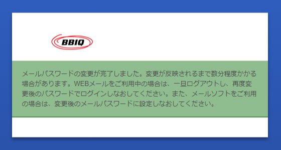 BBIQメールパスワードの変更方法を教えてください。 QTnet会員専用ページ、またはWebメールからお手続きいただけます。 QTnet会員専用ページでの変更方法 1 QTnet会員専用ページにログイン後、上部メニューの[ ご契約サービス ]を選択し、「ご利用中の電子メール」にある[ 確認する ]を選択します。 2 現在ご利用中のBBIQメールアドレスの一覧から、BBIQメールパスワードを変更したいBBIQメールアドレスの[ 変更する ]を選択します。 3 パスワードを設定・変更するBBIQメールアドレスを確認します。 「その他のオプションサービス一覧」にあるメールパスワード変更の[ 変更 ]を選択します。 4 新しいパスワードを入力して、[ 上記の内容で変更する ]を選択します。 BBIQメールパスワードについて BBIQメールパスワードの文字数は4文字以上、16文字以内です。 使用できる文字は、アルファベットと数字です。 アルファベットは大文字/小文字を区別します。 5 BBIQメールパスワード変更の完了です。 パスワードの変更が反映されるまで、10~30分ほどかかります。 メールアプリへアカウント設定済みの場合、変更反映後に設定変更をお願いします。 メールソフトの設定変更について メールパスワード変更後、お客さまがご利用中のメールソフトの設定を変更する必要があります。 メールパスワード変更後の設定方法 Topへ Webメールでの変更方法 1 パスワードを変更したいメールアドレスでWebメールにログイン後、 画面右上のメールアドレス横の[ ▼ ]を選択します。 ※ スマートフォン版では設定できませんので、パソコン版でログインしてください。 2 [ パスワードを変更 ]を選択します。 3 「現在のパスワード」「新しいメールパスワード」「新しいメールパスワード(再入力)」を入力して、[ 保存 ]を選択します。 現在のメールパスワード :現在利用中のメールパスワード 新しいメールパスワード :変更後のメールパスワード 新しいメールパスワード(再入力) :[ 新しいメールパスワード ]に入力した同じ文字列 4 メールパスワードの変更が完了しましたとの画面が表示されます。 以上で、完了です。 メールソフトの設定変更について メールパスワード変更後、お客さまがご利用中のメールソフトの設定を変更する必要があります。 メールパスワード変更後の設定方法 Topへ お役に立ちましたか? 役に立った 役に立たなかった 改善のため、「よくあるご質問」へご意見をお寄せください いただいたご意見・ご要望については、お客さまに直接ご回答を差し上げることができません。 回答をご希望される場合は、お問合せ受付フォームをご利用ください。 回答する アンケートにご協力ありがとうございました