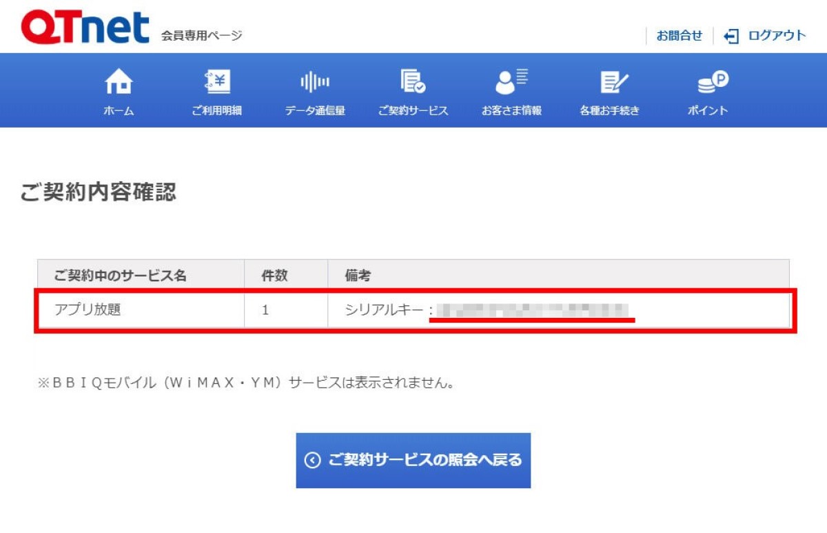 アプリ放題のシリアルキーの確認方法を教えてください。