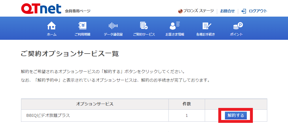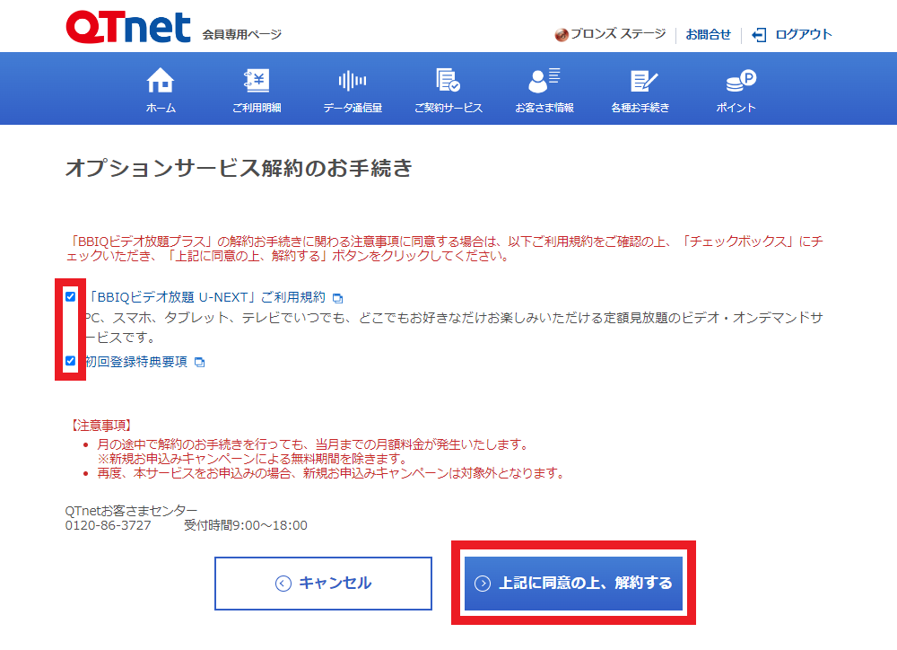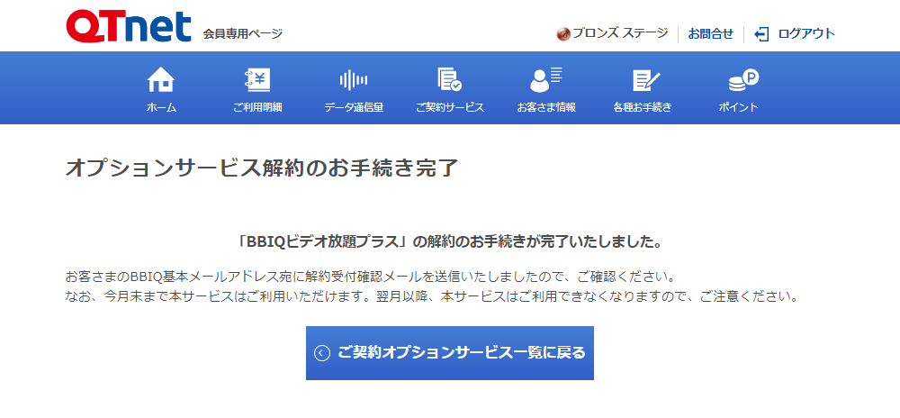 BBIQビデオ放題 U-NEXTの解約方法を教えてください。 QTnet会員専用ページ、またはお電話で受け付けいたします。 解約月の月末までご利用いただけます。(日割り計算はありません) QTnet会員専用ページでのお手続き方法 1 QTnet会員専用ページにログイン後、上部メニューの[ ご契約サービス ]を選択し、「オプションサービスの解約」の[ お手続きへ進む ]を選択します。 2 「BBIQビデオ放題スマート」または「BBIQビデオ放題プラス」の[ 解約する ]を選択します。 3 「BBIQビデオ放題 U-NEXT ご利用規約」と「初回登録特典要項」を確認し、チェックボックスにチェックの上、[ 上記に同意の上、解約する ]を選択します。 4 解約お手続きは完了です。お手続きいただいた日の月末をもって、BBIQビデオ放題はご利用いただけなくなります。 解約の取消については、お手続きの当月まで可能です。 その際は、QTnetお客さまセンター(0120-86-3727)までお問合せください。 Topへ お電話でのお手続き方法 BBIQからお申込みのお客さまは、QTnetお客さまセンターまでお問合せください。 QTnet お客さまセンター(総合窓口) 0120-86-3727 【受付時間】 9~18時 / 年中無休 番号はお間違いのないようにご注意ください。 今後のサービス向上のために通話は録音させていただきます。 お役に立ちましたか? 役に立った 役に立たなかった 改善のため、「よくあるご質問」へご意見をお寄せください いただいたご意見・ご要望については、お客さまに直接ご回答を差し上げることができません。 回答をご希望される場合は、お問合せ受付フォームをご利用ください。 回答する アンケートにご協力ありがとうございました